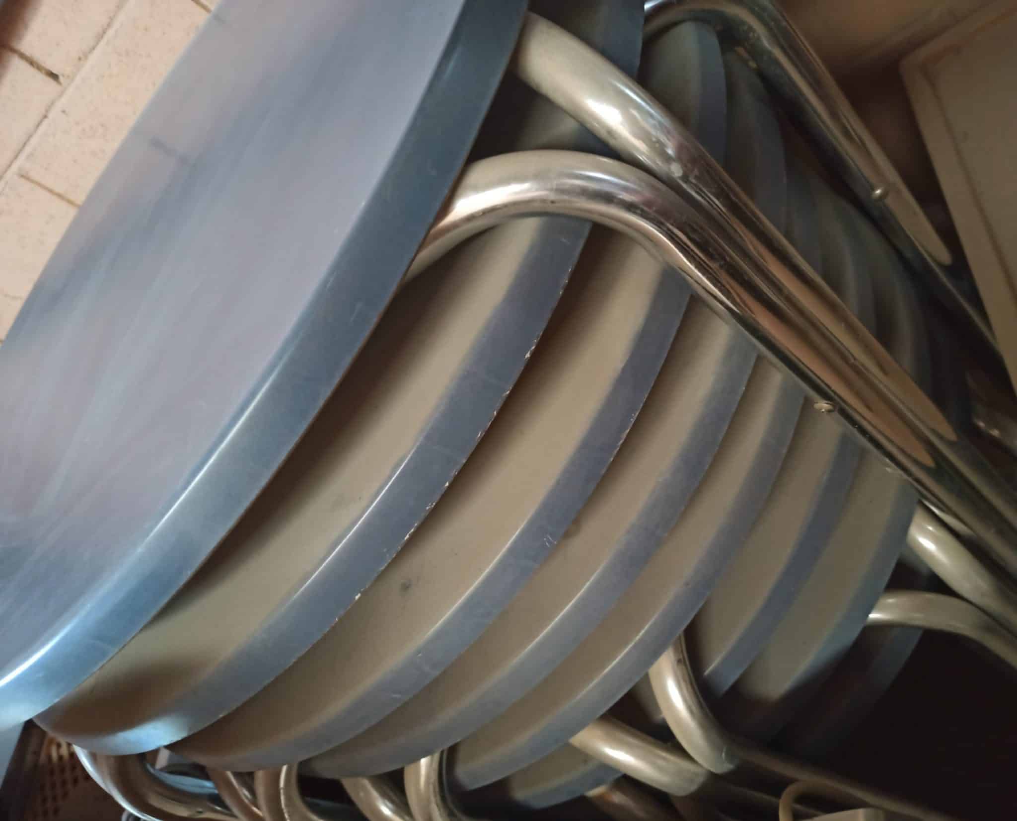 8 mesas redondas con patas de aluminio, apilables (para ocupar el mínimo espacio), de fácil limpieza. A RECOGER EN TARRAGONA