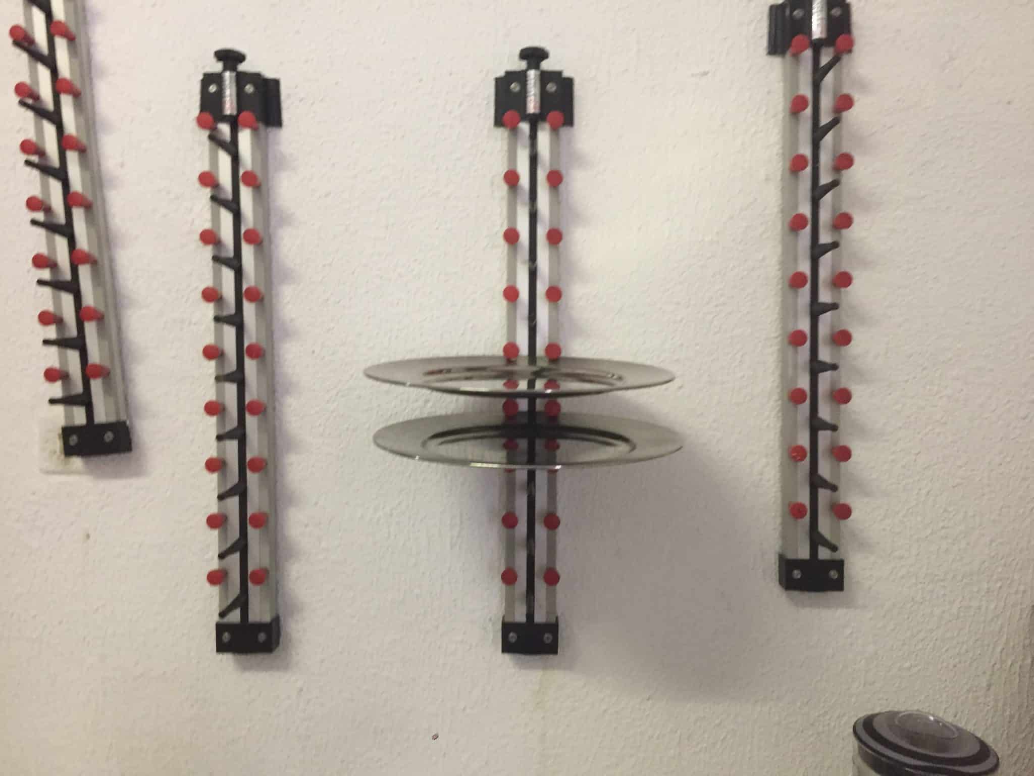 COLUMNA DE EMPLATAR – PORTAPLATOS 9 Para instalar sobre pared en cocinas. Capacidad para 9 platos. Fijación a pared mediante Tornillos. Uso especial en cocinas de Hostelería, Bar, Restaurantes, Colegios, Colectividades, Restaurantes, etc ., Características: Estable, seguro. Sumamente duradero. No se agrieta ni oxida. Los modelos de pared más pequeños son su mayor ayuda. Son idóneos para eventos, cocinas y barras de hostelería. La altura entre los soportes rojos y negro es fácilmente regulable mediante los pomos giratorios superiores lo que permite soportar diferentes tipos de platos o fuentes. Si se cuelgan uno al lado del otro, también son adecuados para almacenar bandejas. Apto para todo tipo de plastos en función del peso del contenido del mismo