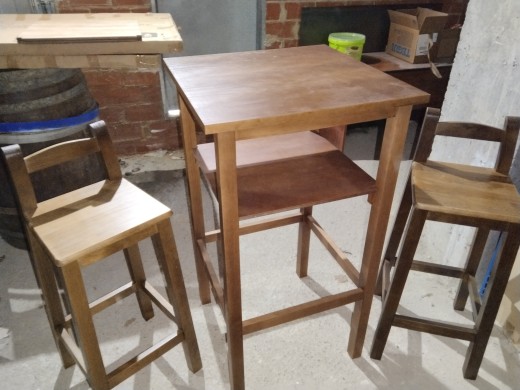 JUEGO DE MESAS ALTAS Y TABURETES CON Y SIN RESPALDO, EN COLOR NOGAL✅