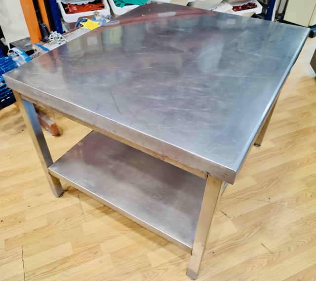 Mesa de trabajo de acero inoxidable con señales lógicas de uso pero en buen estado. Con bandeja inferior.