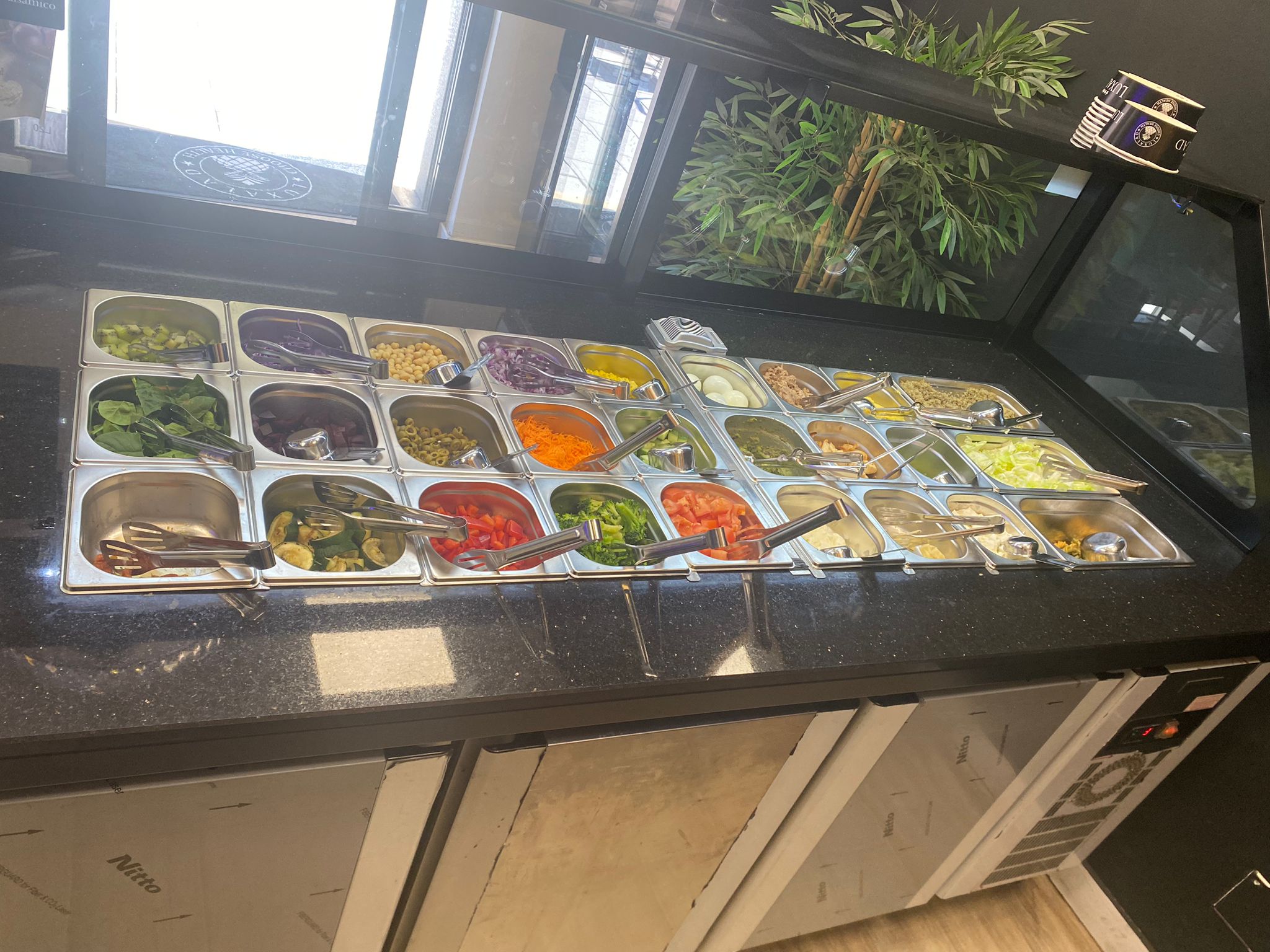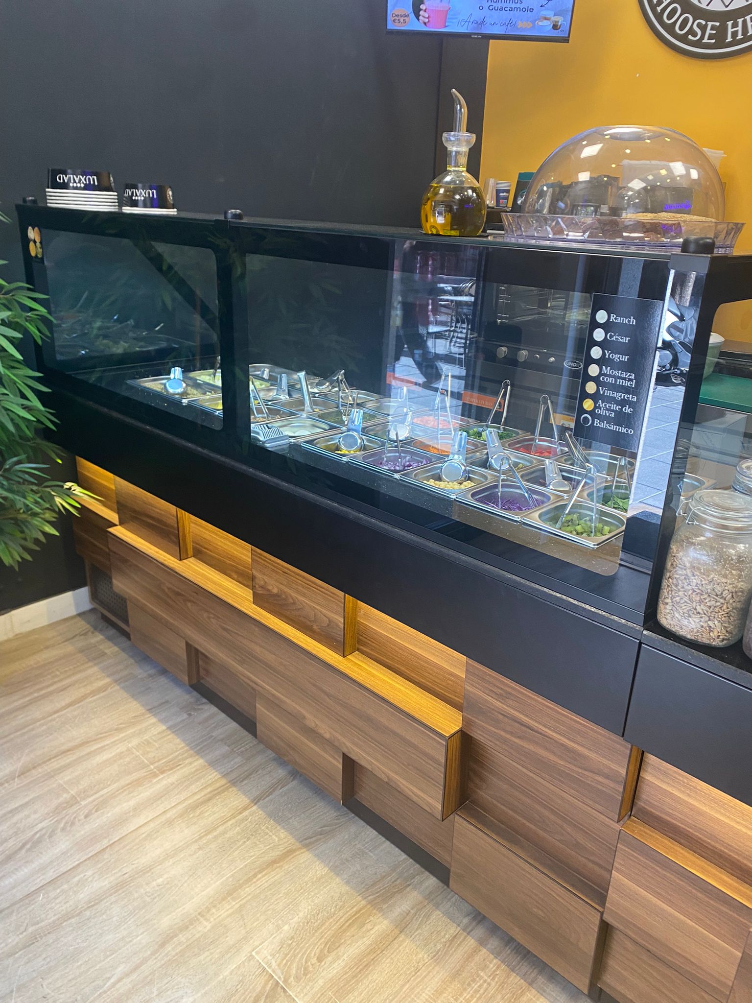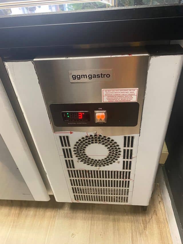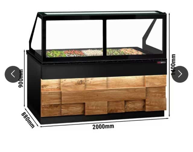 Mesa refrigerada tipo saladette TORONTO. 6 meses de uso – Frontal de madera – 3 puertas macizas – Vitrina de cristal -Encimera de granito negro – Iluminación LED interior y exterior – Enfriamiento de 0 °C hasta 5 °C – Excelente para uso profesional – Panel de control digital para la función de temperatura y descongelamiento Se pueden consultar los detalles completos en la pagina de ggmgastro (precio original 5.028 euros) Fabricado de acuerdo con las normativas vigentes en materia de higiene y seguridad Cumple las regulaciones CE El material cumple con los estándares alimentarios Europeos y Españoles.