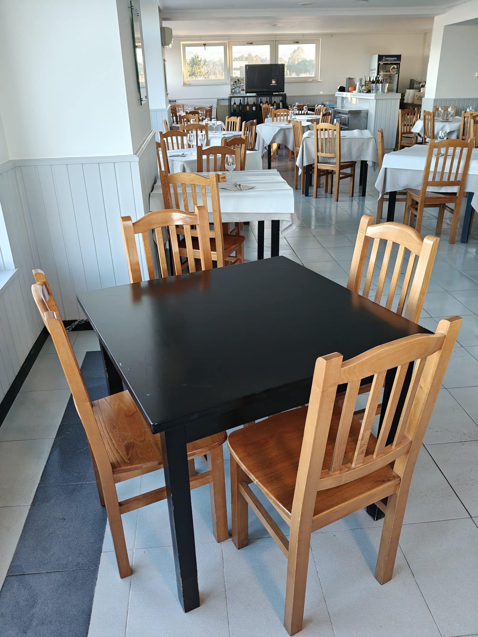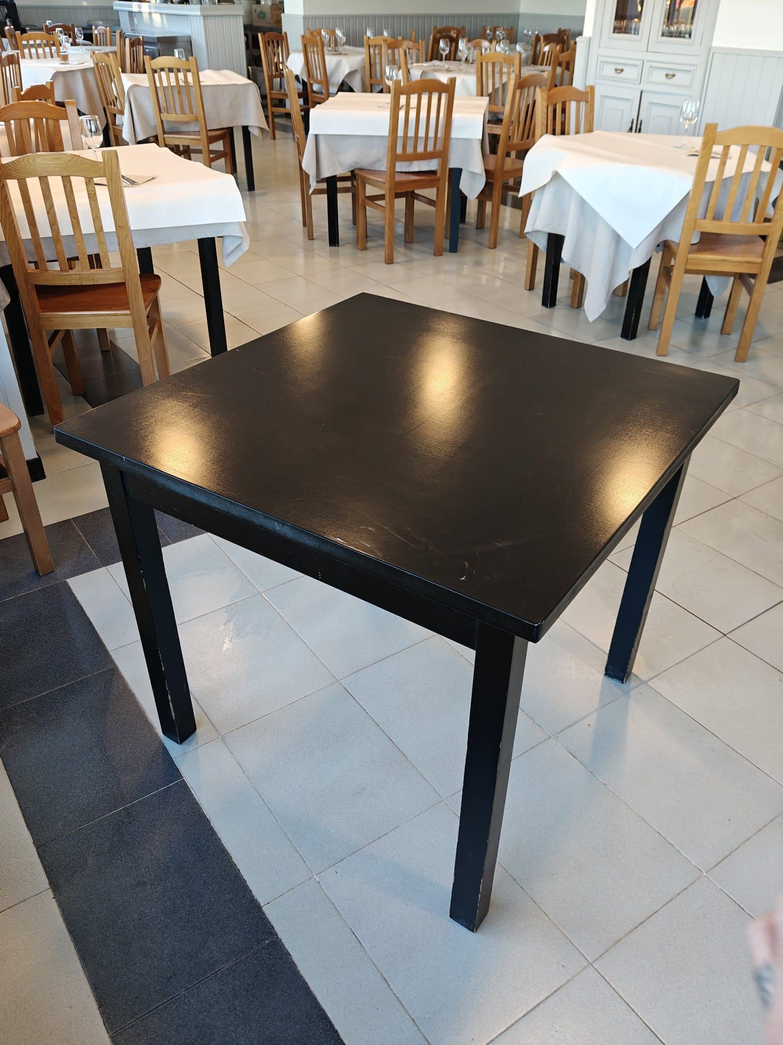 Se presentan mesas cuadradas de madera de haya color negro.