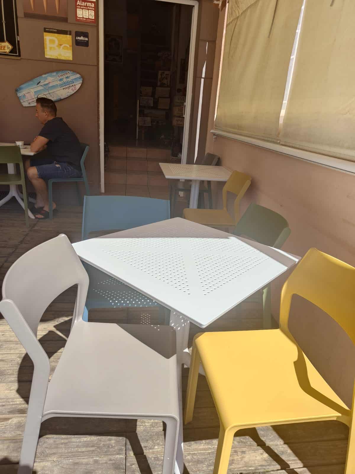 Vendo lote de 4 mesas redondas, 5 cuadradas y 18 sillas de colores. No hago envíos, recogida en el local.