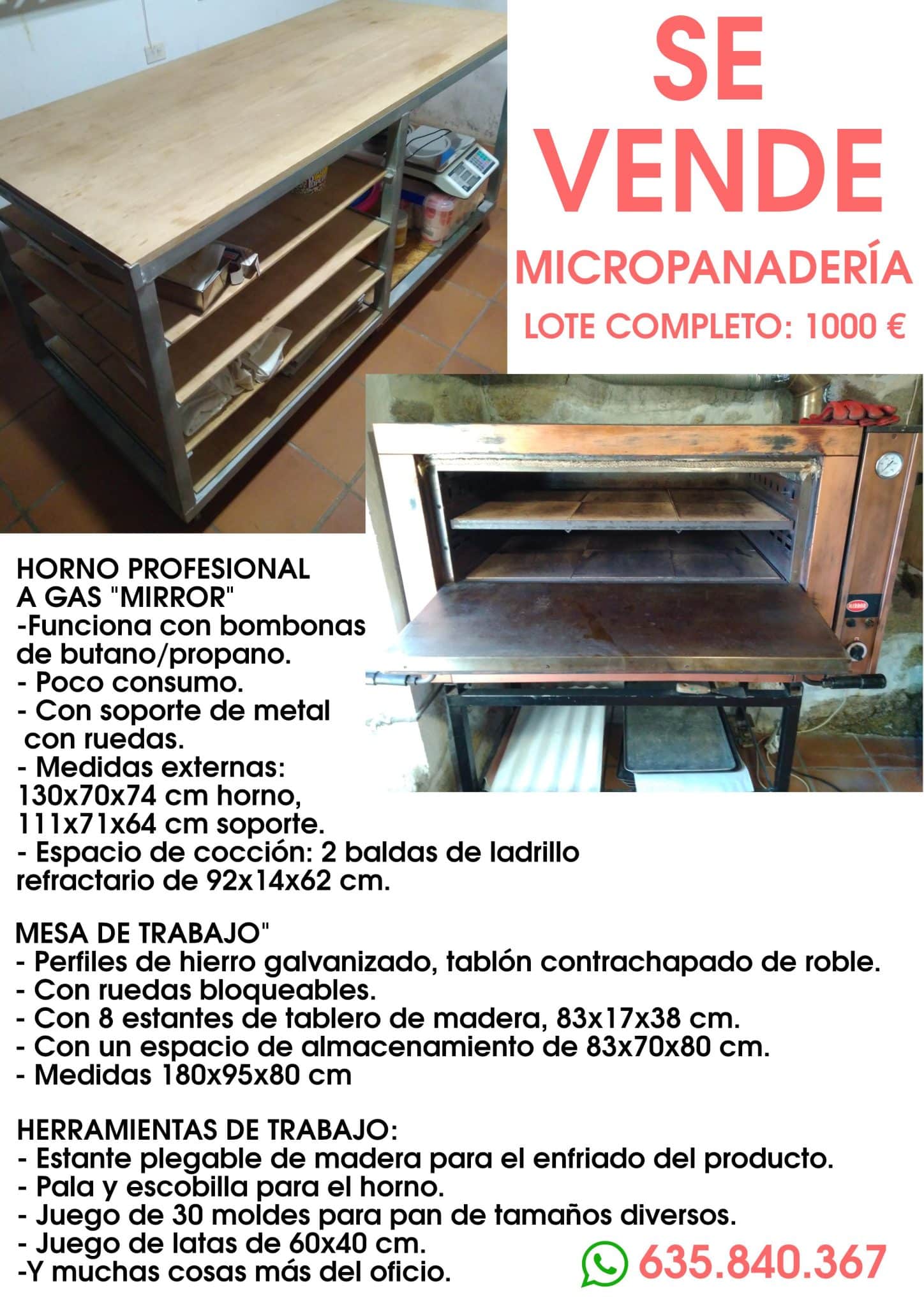 Se vende micropanadería. Horno a gas marca «Mirror». Mesa de trabajo. Útiles y herramientas del oficio. Personas interesadas contactar con Alba al 635.840.367. Preferiblemente whatsapp.